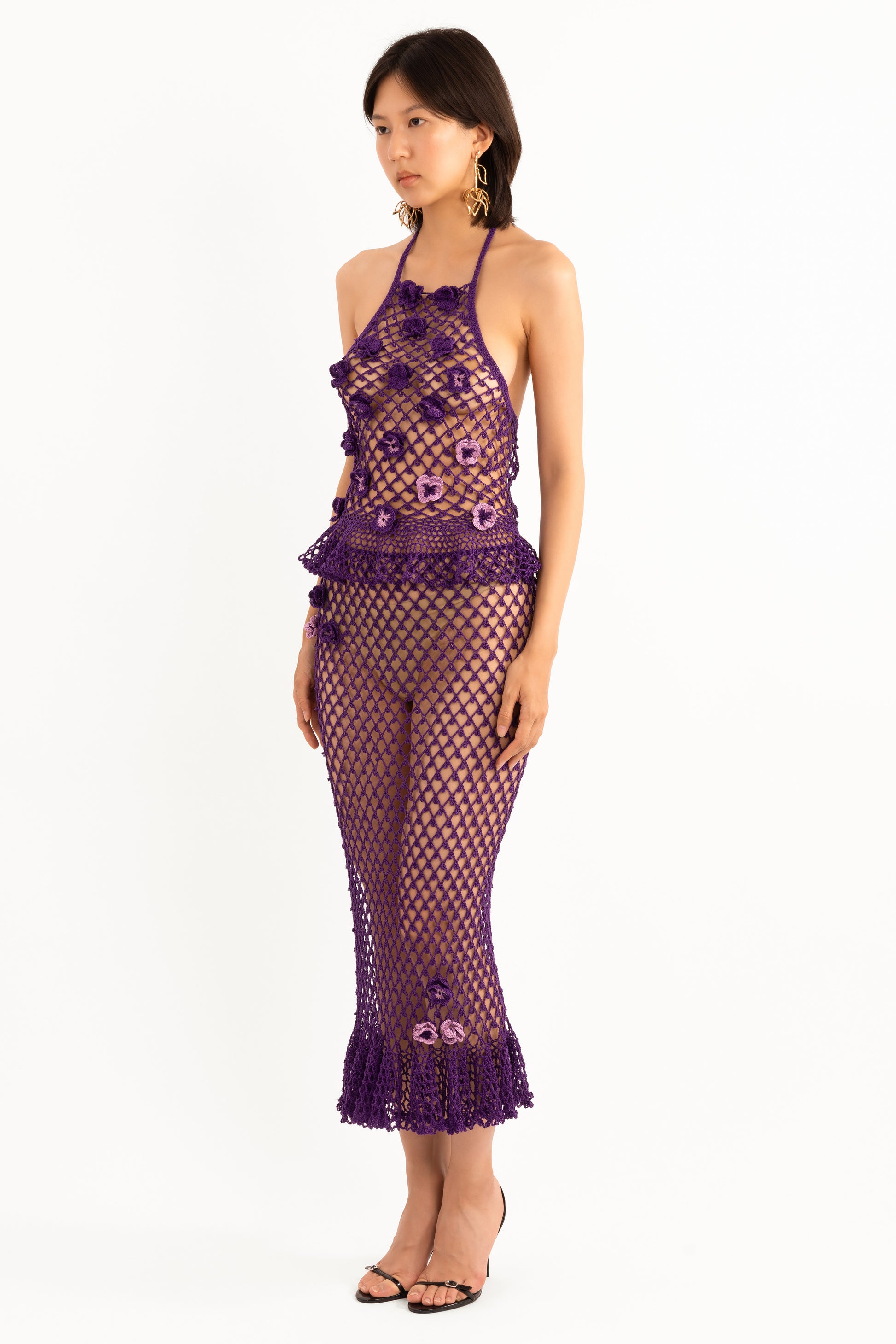 Handmade crochet halter top with an open-net design, adorned with delicate 3D pansy flowers. A lightweight, artisanal piece that adds texture and femininity to any look.