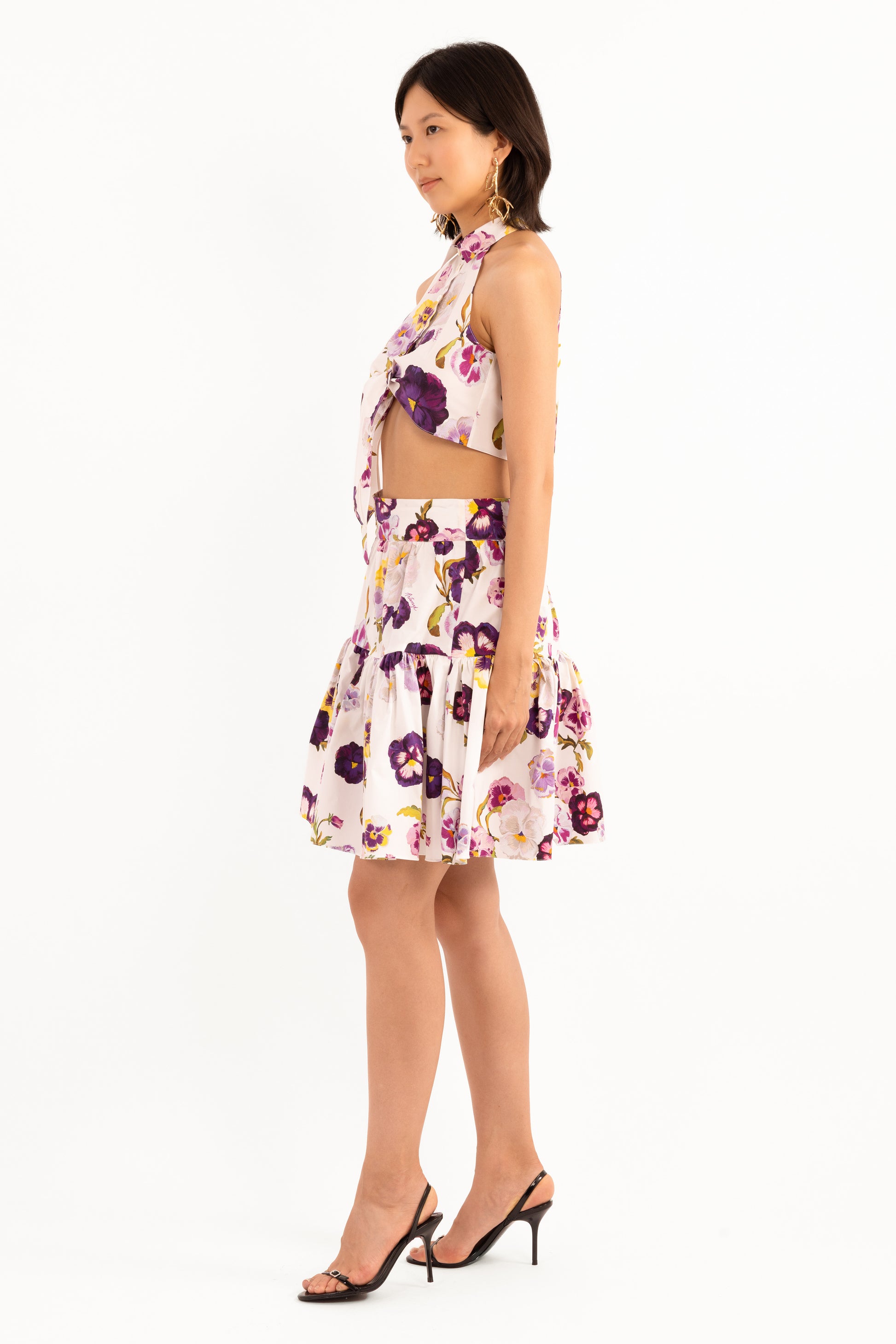 This skirt is cut from cotton poplin blend in a high-waisted silhouette with soft gathers that create volume and movement. Printed with hand-painted florals, it offers a coordinated yet versatile look that can be paired with the tied top or styled separately. Its mini length brings a youthful energy, while the poplin fabric ensures a crisp, flattering shape.