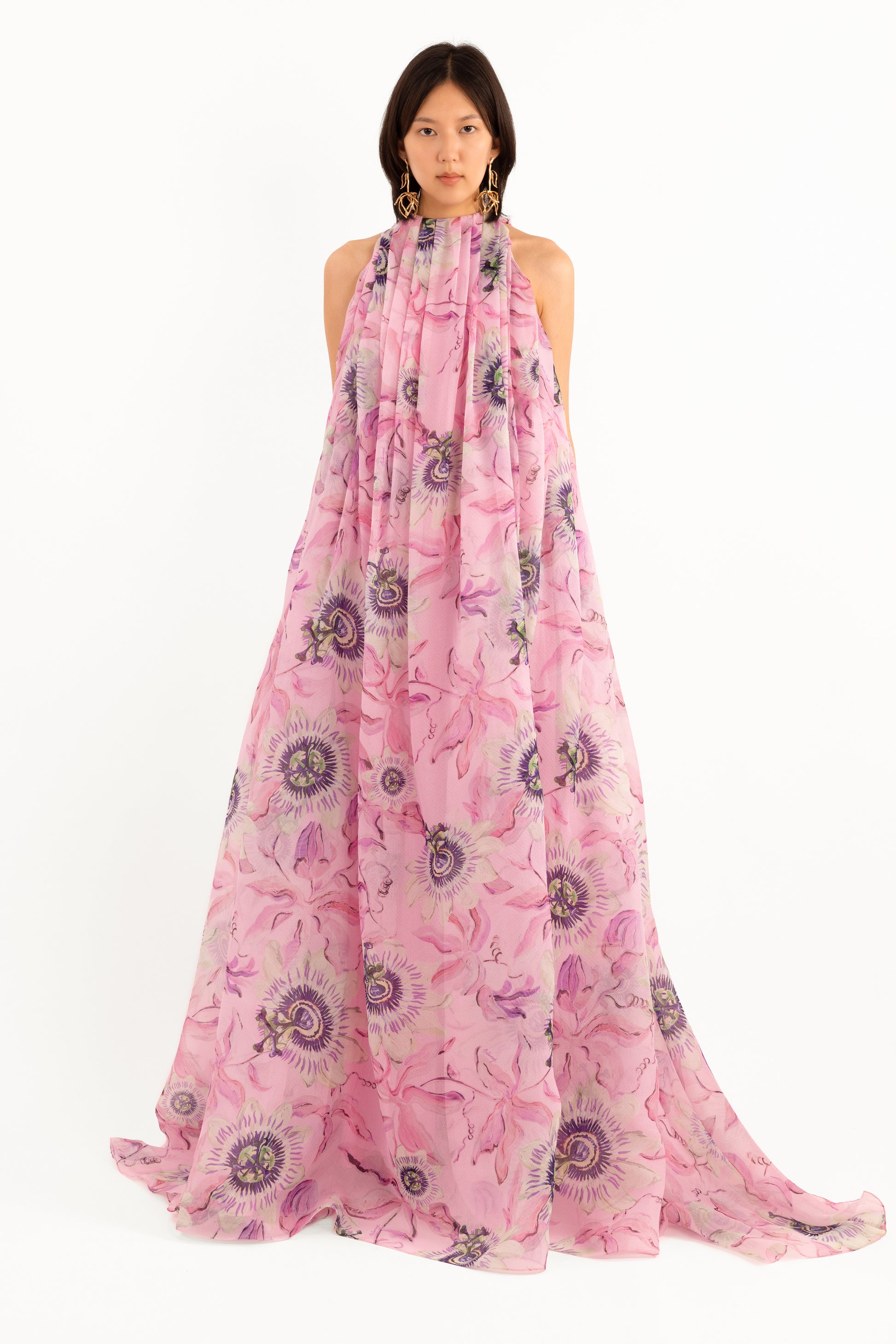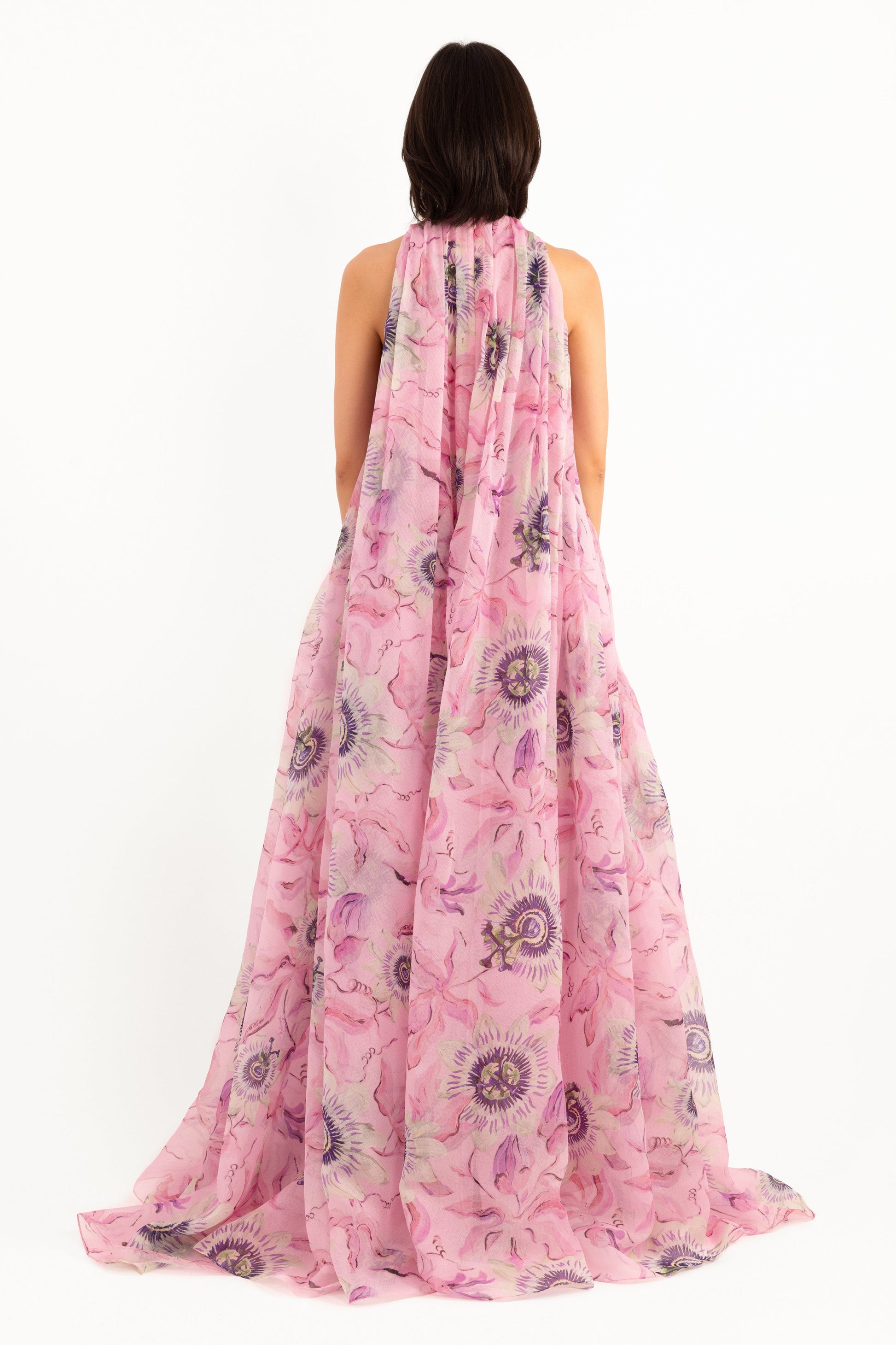 This halter-neck gown is crafted from luxurious and special silk-blend gazar, designed with a voluminous silhouette that flows into a dramatic floor-length train. The structured yet airy fabric highlights an all-over floral print in soft pink and purple tones, creating a balance of elegance and modern femininity. Perfect for evening occasions or statement moments.